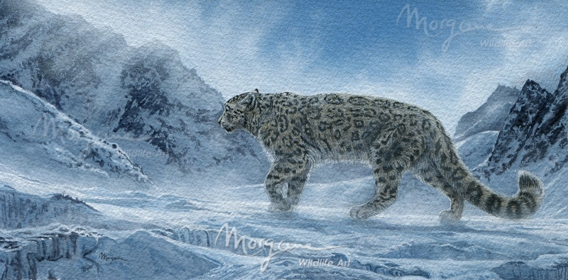 A snow leopard climbing in the cold and harsh mountains.