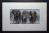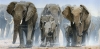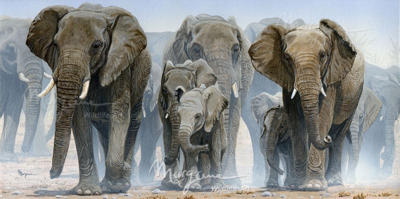 An elephant family marching in the dust.