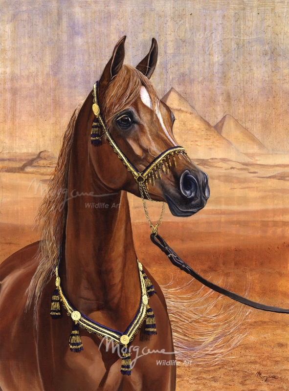 A beautiful Egyptian Arabian filly is standing proudly in front of the pyramids, bathed in the desert light.