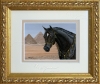 A beautiful Egyptian Arabian horse in traditional costume in front of the pyramids in the desert.