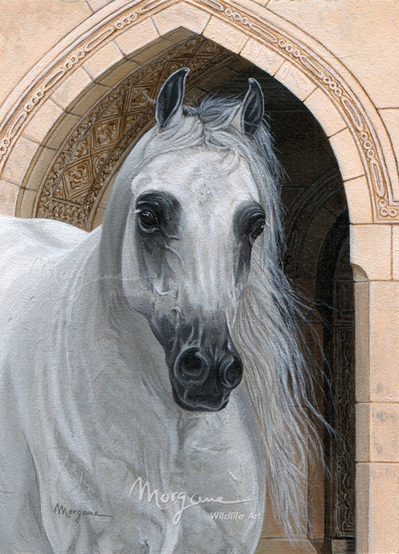 A graceful grey Arabian horse standing in front of a skillfully decorated arabic arch. Straight from the Arabian Nights.