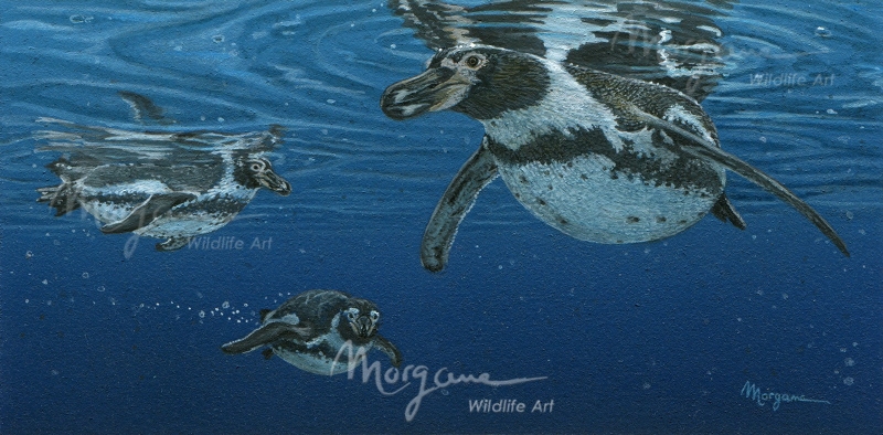 3 Humboldt pinguins bobbing along in the deep blue sea, looking at you curiously. Got fish?