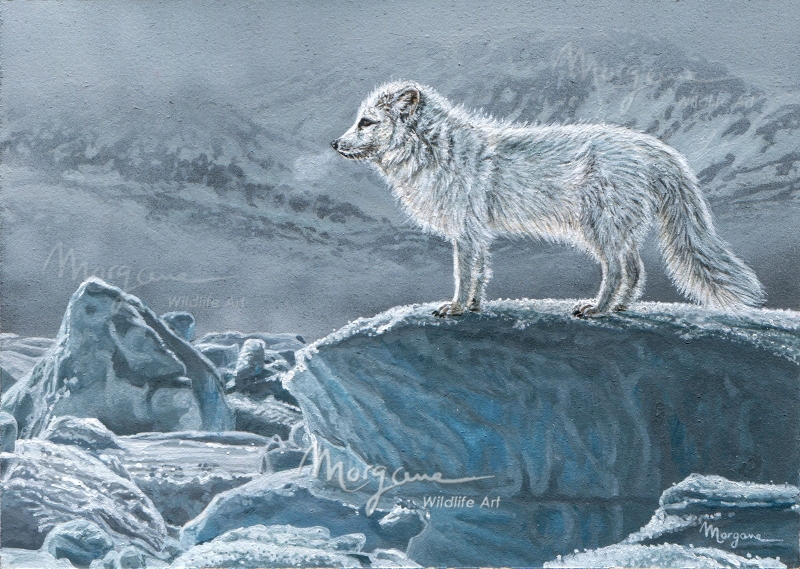 A polar fox enjoying the arctic light illuminating the ice and giving blue and grey shades to this white landscape.