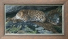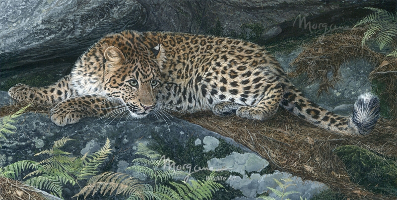 A rare Amur leopard cub lounging cozily on a bed of pine needles in the forest.