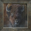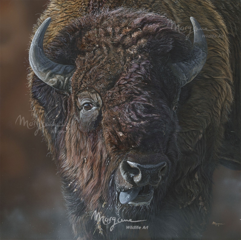 "It was rutting season and I was watching this powerful male buffalo from the safety of my car as he went down to wallow in a pit. He emerged in a cloud of dust, matted in mud and grass. He was bellowing excitedly, drooling and with his eyes rolling, challenging the other males around. I was admiring his curly coat and mighty horns thinking that would make a great painting when he suddenly rushed out of his pit, going straight toward me, tail raised and kicking like crazy. I sat very still, praying that he would not crush my car. He finally veered and passed by only an inch, making the car shake (or maybe that was me?). It’s an encounter that was engraved in my memory and in that piece I wanted to show the raw power and glory of this bison as I experienced it that day."