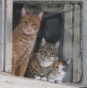 3 gossiping cats looking out of the window.