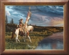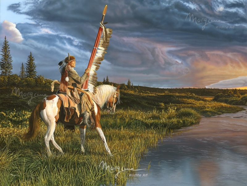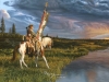 A Cheyenne War Party Leader (from the 1860's -1870's) carrying a lance of eagle feathers and riding in the golden sunlight.