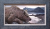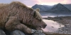 A brown bear laying on logs by a lake, slumbering in the soft morning light.
