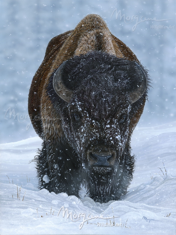Buffalo can weight over a ton and are supremely adapted to winter. Their massive heads and necks act like snow plows to dig up every blade of grass available. They are so well insulated that even the snow lying on their bodies will not even melt! Yet, winter can be brutal and I am always in awe at how enduring these animals truly are, facing the threats of the weather and predators alike.