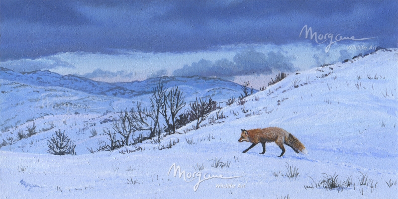 A red fox patrolling its territory in the snowy hills by the cold January light.