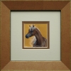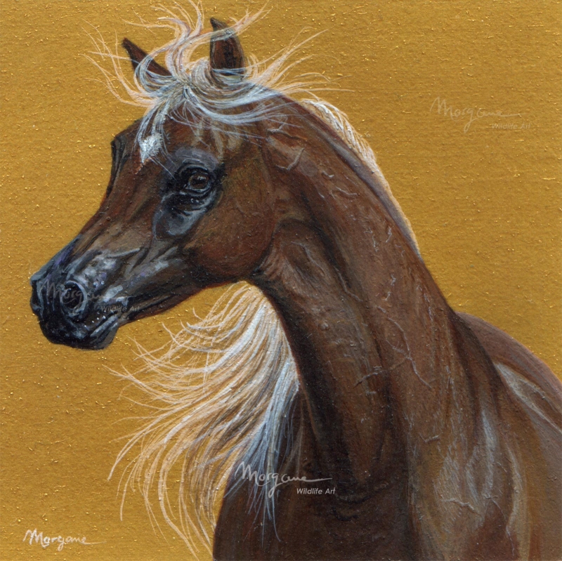 A fiery flaxen chestnut Arabian horse on a gold paint background. Gilded with metallic golf leaves.