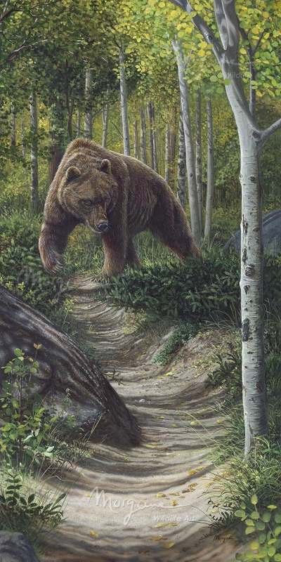 A grizzly bear on a narrow hiking path.
